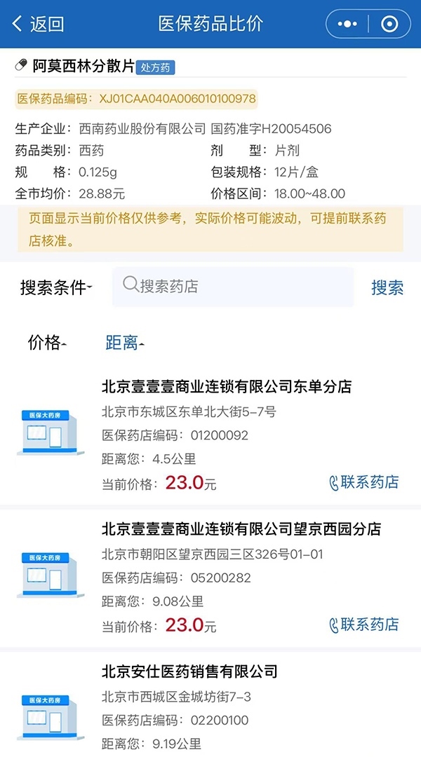 第五步:點擊“在售藥店”,即可看到按照距離遠近、價格高低等維度排序的藥店信息。