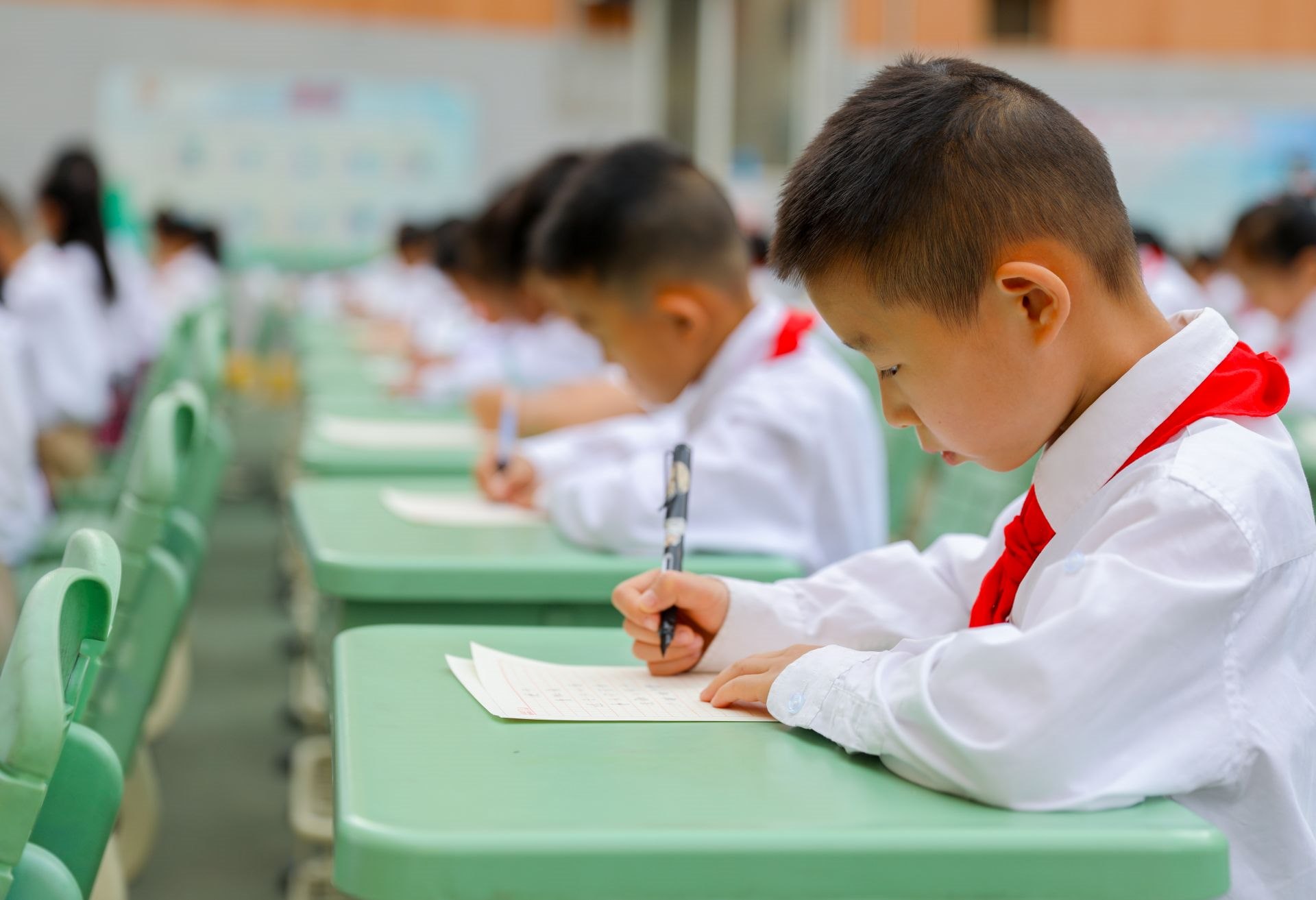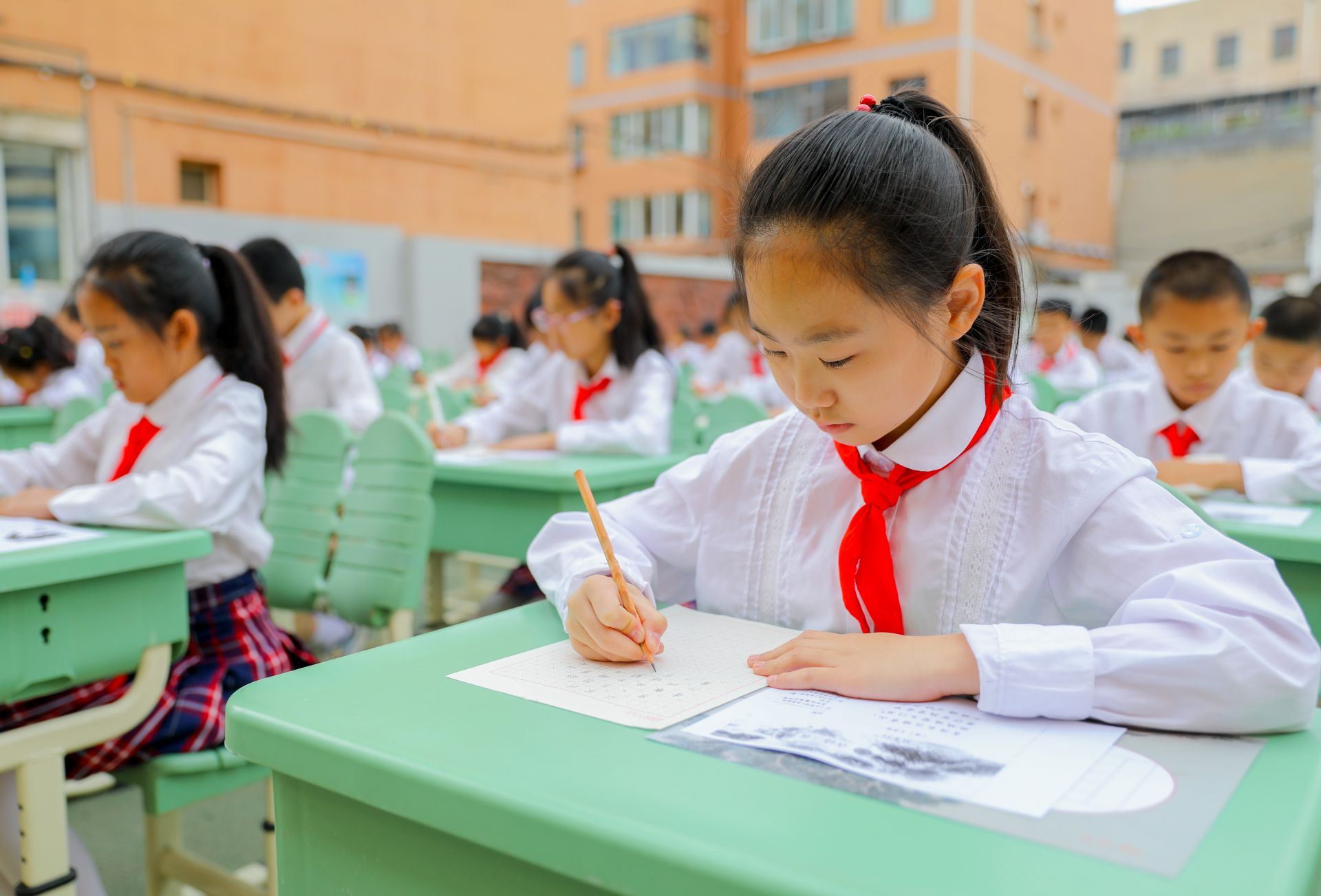 6月13日,呼和浩特市玉泉區(qū)恒昌店巷小學的學生們正在參加書法比賽。當日,該?!靶@書法文化節(jié)”漢字書寫大賽開賽,200多名學生在硬筆和軟筆項目上展開比拼。活動旨在提高孩子們漢字書寫水平,弘揚中華民族優(yōu)秀傳統(tǒng)文化。