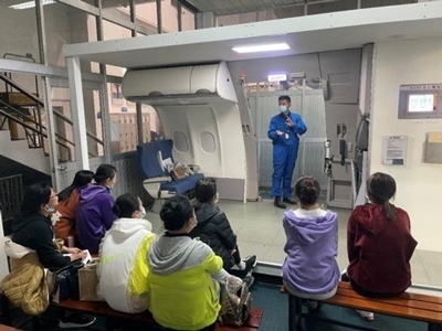 航空企業(yè)在實(shí)訓(xùn)基地組織實(shí)施空乘專業(yè)教師培訓(xùn)項(xiàng)目,此為參訓(xùn)教師學(xué)習(xí)正常與緊急情況開關(guān)艙門的要領(lǐng)、機(jī)上應(yīng)急設(shè)備
