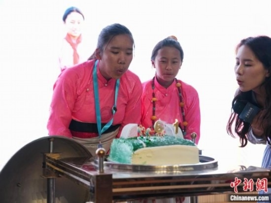 鬧增拉毛和卓尕才仁吹蛋糕。中新社崔楠 攝
