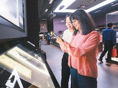 兩位觀眾在中國(guó)考古博物館內(nèi)的“甲骨互動(dòng)體驗(yàn)區(qū)”參與體驗(yàn)活動(dòng)。新華社記者 李 賀攝