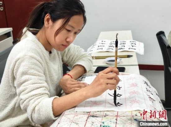 4月3日,在北京華文學(xué)院參加中文學(xué)習(xí)班的泰國(guó)學(xué)員吳嘉莉正在練習(xí)書法。(中新網(wǎng)記者韓輝 攝)
