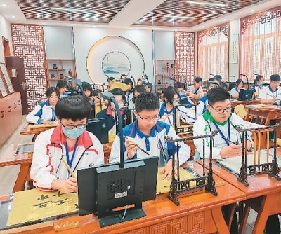 | 5月7日,參加“寧夏歷史文化、自然資源與環(huán)境保育探索之旅”交流活動的香港中學(xué)生在寧夏銀川市第六中學(xué)學(xué)寫毛筆字。新華社記者 艾福梅攝 |