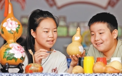 山東省棗莊市龍山路街道非遺作坊,小學生在學習制作彩繪葫蘆。 孫中喆攝(人民視覺)