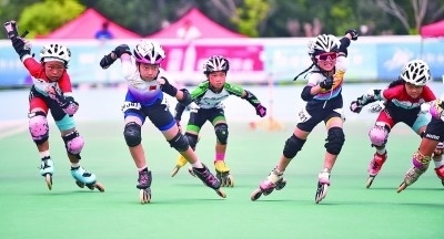 河南洛陽,小朋友們?cè)隗w育公園內(nèi)參加速度輪滑友誼賽。新華社發(fā)