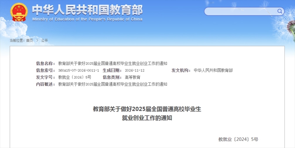 記者11月13日從教育部獲悉,教育部近日印發(fā)通知,部署做好2025屆全國普通高校畢業(yè)生就業(yè)創(chuàng)業(yè)工作。通知提出實施2025屆全國普通高校畢業(yè)生就業(yè)創(chuàng)業(yè)促進(jìn)和服務(wù)體系建設(shè)行動,全力促進(jìn)高校畢業(yè)生高質(zhì)量充分就業(yè)。