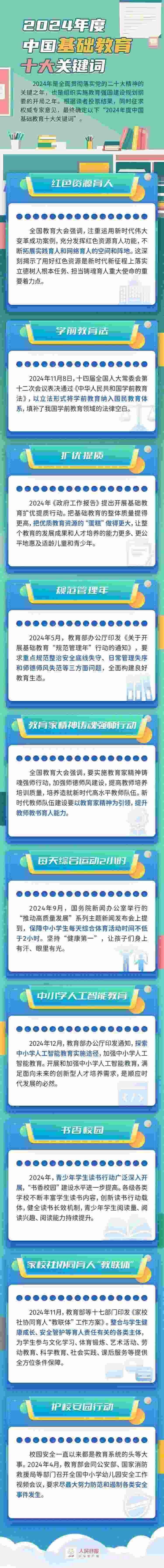 教育興則國家興,教育強則國家強。建設教育強國,基點在基礎教育。2024年是組織實施教育強國建設規(guī)劃綱要的開局之年。這一年來,中國基礎教育領域在深化綜合改革、加快推進高質(zhì)量發(fā)展的道路上奮勇向前,不斷增強人民群眾的教育獲得感、幸福感、安全感,繼續(xù)答好“強國建設、教育何為”的時代課題。在教育部基礎教育司指導下,人民日報少年客戶端推出《揭曉!2024年中國基礎教育十大關(guān)鍵詞》圖解,讓我們一起關(guān)注。