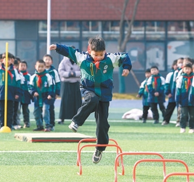 青島市李滄區(qū)是山東省內(nèi)較早推廣15分鐘課間的地區(qū),當(dāng)?shù)馗餍R虻刂埔?,結(jié)合校園特色將體育活動開展得豐富多彩。青島東川路小學(xué)在操場分設(shè)6個(gè)活動點(diǎn),地面上畫好跳房子、百變大腳丫、步步登高、投擲區(qū)等不同格子,由班主任帶領(lǐng)學(xué)生,開發(fā)多種闖關(guān)類游戲,鼓勵(lì)學(xué)生創(chuàng)造新玩法。