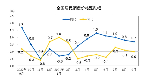 國(guó)家統(tǒng)計(jì)局14日發(fā)布數(shù)據(jù),9月份,全國(guó)居民消費(fèi)價(jià)格指數(shù)(CPI)同比上漲0.7%,漲幅比上月回落0.1個(gè)百分點(diǎn);工業(yè)生產(chǎn)者出廠價(jià)格指數(shù)(PPI)同比上漲10.7%,漲幅比上月擴(kuò)大1.2個(gè)百分點(diǎn)。