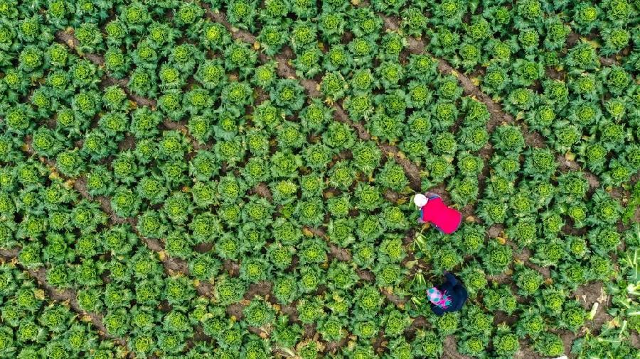 2021年11月4日,河北省唐山市豐南區(qū)王蘭莊鎮(zhèn)高先甸村的菜農(nóng)在蔬菜基地收獲大白菜(無人機(jī)照片)。新華社發(fā)(劉滿倉(cāng)攝)