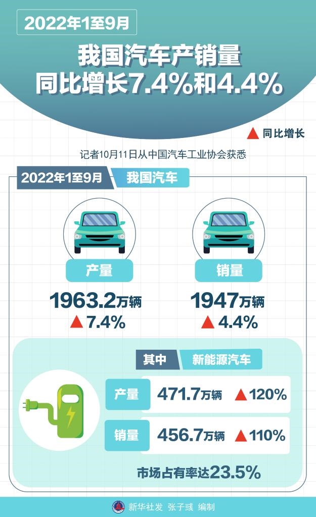 記者11日從中國汽車工業(yè)協(xié)會獲悉,今年1至9月,我國汽車產(chǎn)銷量分別達1963.2萬輛和1947萬輛,同比增長7.4%和4.4%。其中,新能源汽車產(chǎn)銷量分別達471.7萬輛和456.7萬輛,同比增長120%和110%,市場占有率達23.5%。