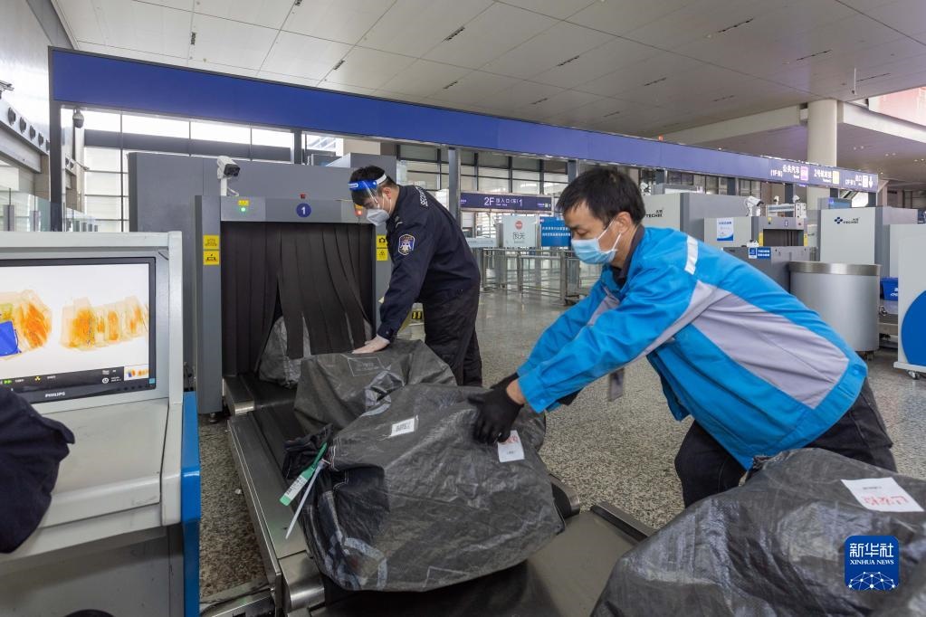 11月1日,在上海虹橋站內(nèi)貨物專用安檢口,鐵路工作人員搬運(yùn)通過安檢的貨物。新華社記者 王翔 攝