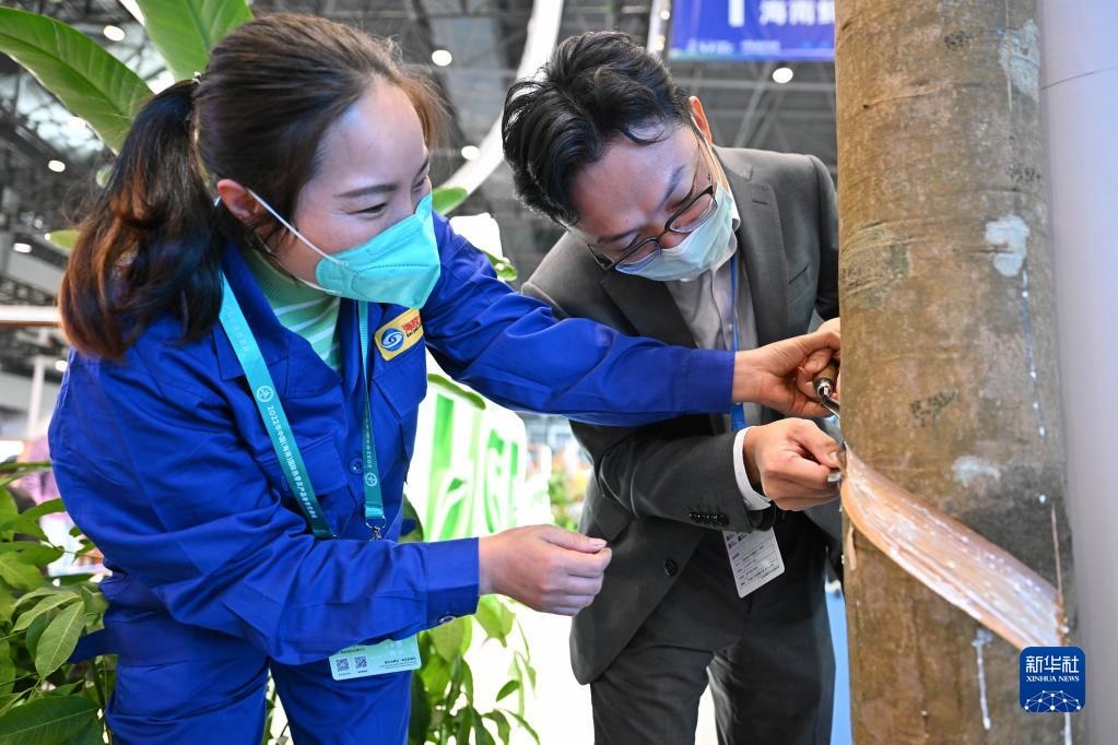 12月15日,觀眾在工作人員的指導下體驗割膠。新華社記者 郭程 攝