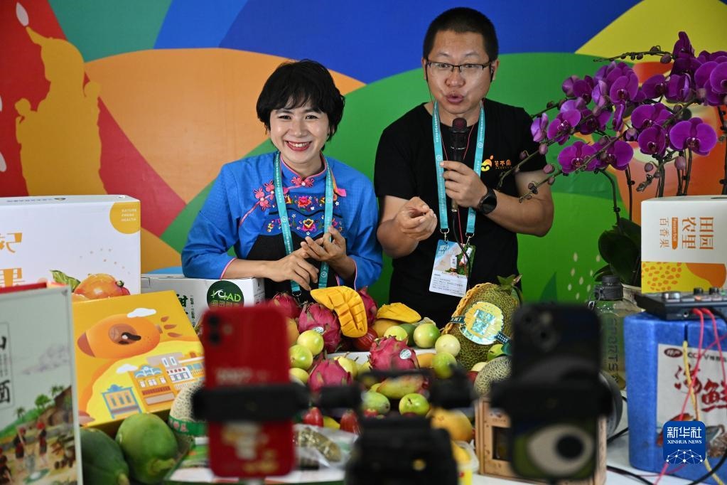 12月15日,海南三亞展臺的工作人員在直播銷售農產(chǎn)品。新華社記者 郭程 攝