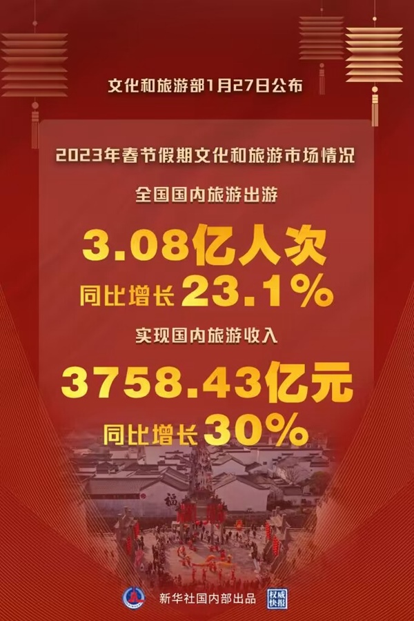 文化和旅游部27日公布2023年春節(jié)假期文化和旅游市場情況。經(jīng)文化和旅游部數(shù)據(jù)中心測算,今年春節(jié)假期全國國內(nèi)旅游出游3.08億人次,同比增長23.1%。實(shí)現(xiàn)國內(nèi)旅游收入3758.43億元,同比增長30%。全國文化和旅游市場總體安全平穩(wěn)有序。
