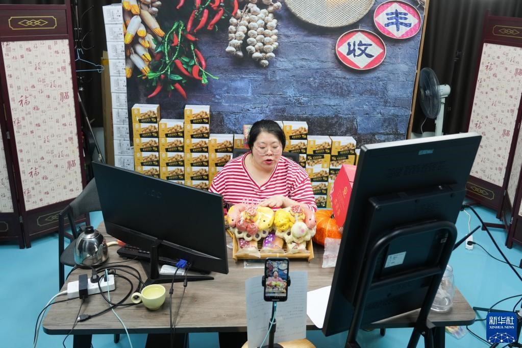 2月17日,威海長林生態(tài)農(nóng)業(yè)有限公司員工直播銷售花餑餑產(chǎn)品。新華社記者 朱崢 攝