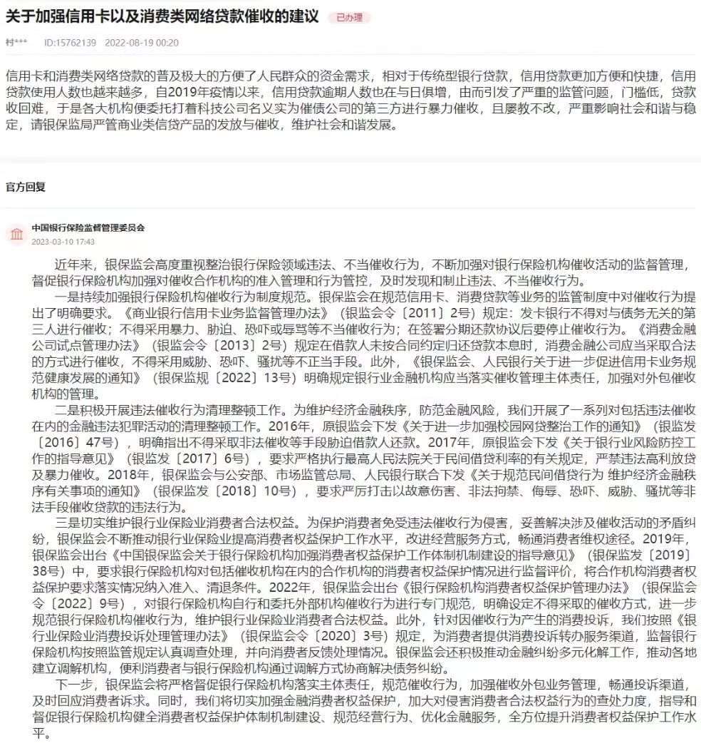 銀保監(jiān)會在回復中表示,近年來,銀保監(jiān)會高度重視整治銀行保險領域違法、不當催收行為,不斷加強對銀行保險機構催收活動的監(jiān)督管理,督促銀行保險機構加強對催收合作機構的準入管理和行為管控,及時發(fā)現(xiàn)和制止違法、不當催收行為。