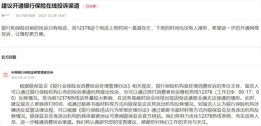 針對網(wǎng)友提出的“建議開通銀行保險在線投訴渠道”,銀保監(jiān)會在回復中表示,將努力優(yōu)化消費者投訴維權熱線12378系統(tǒng),充實話務人員,進一步暢通消費投訴渠道。