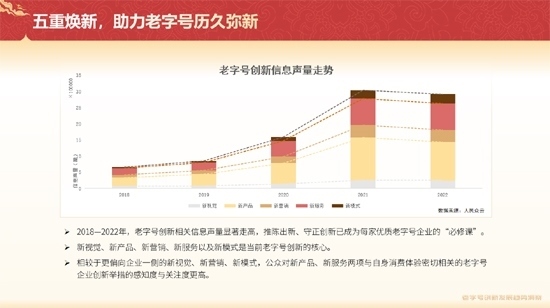 《報(bào)告》基于近五年傳播與實(shí)體數(shù)據(jù)信息,綜合運(yùn)用全量及抽樣分析方法,洞察老字號五大創(chuàng)新發(fā)展趨勢,分析老字號在創(chuàng)新過程中暴露出的不足,并提出針對性建議舉措。
