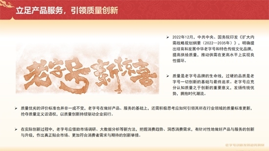 《報(bào)告》分析稱,老字號企業(yè)可以從四方面推進(jìn)創(chuàng)新進(jìn)程,提高創(chuàng)新質(zhì)效。一是立足產(chǎn)品服務(wù),引領(lǐng)質(zhì)量創(chuàng)新;二是挖掘自身特色,強(qiáng)化科技賦能;三是借力政策東風(fēng),蓄勢揚(yáng)帆遠(yuǎn)航;四是創(chuàng)新品牌形象,注重品牌內(nèi)涵。