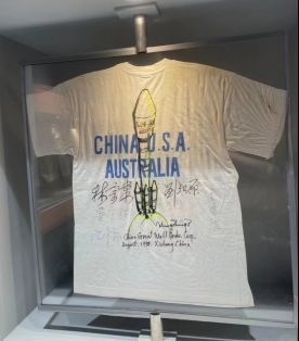 再給大家推薦一個(gè)不容錯(cuò)過的“打卡點(diǎn)”:澳星發(fā)射成功紀(jì)念T恤。這件T恤全部都是著名航天老專家們的“親簽”:林宗棠(時(shí)任航空航天部部長(zhǎng))、劉紀(jì)原(時(shí)任航空航天部副部長(zhǎng))、沈辛蓀(時(shí)任中國(guó)運(yùn)載火箭研究院院長(zhǎng))、王德臣(時(shí)任長(zhǎng)二E火箭總設(shè)計(jì)師)、屠守鍔(時(shí)任長(zhǎng)二E火箭技術(shù)總顧問)等。在紀(jì)念T恤的C位,還有劉竹生院士親筆畫的長(zhǎng)征二號(hào)E運(yùn)載火箭(即“長(zhǎng)二捆”火箭)的漫畫圖。可謂眾“星”云集,珍貴程度可想而知。