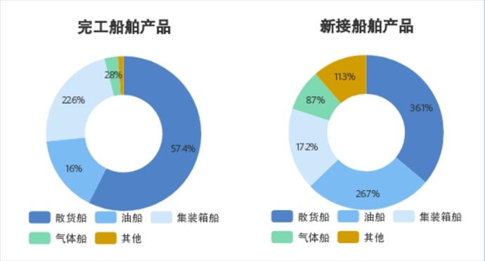 具體來看,在1—3月新接船舶產(chǎn)品訂單結(jié)構(gòu)中,占比最高的散貨船為36.1%,油船占比26.7%,集裝箱船占比17.2%,氣體船占比8.7%。在完工船舶產(chǎn)品結(jié)構(gòu)中,散貨船占比57.4%,集裝箱船占比22.6%,油船占比16%,氣體船占比2.8%。