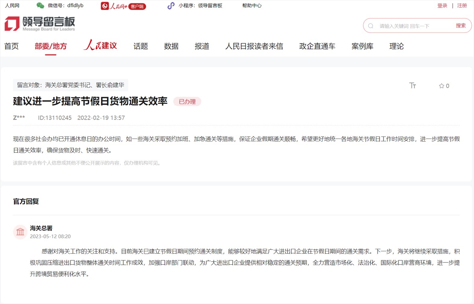 近日,網(wǎng)友通過人民網(wǎng)“領導留言板”對全國海關積極建言獻策,包括外來物種入侵、進一步提高節(jié)假日貨物通關效率等方面。