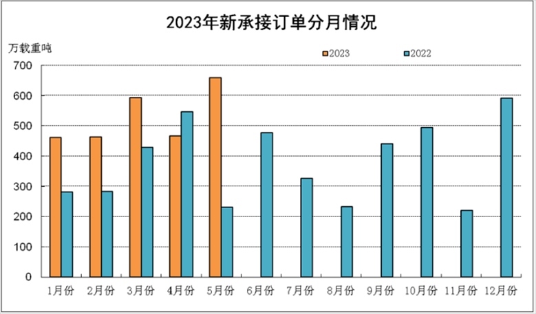 2023年1-5月新承接訂單分月統(tǒng)計(jì)。 來源:中國船舶工業(yè)行業(yè)協(xié)會