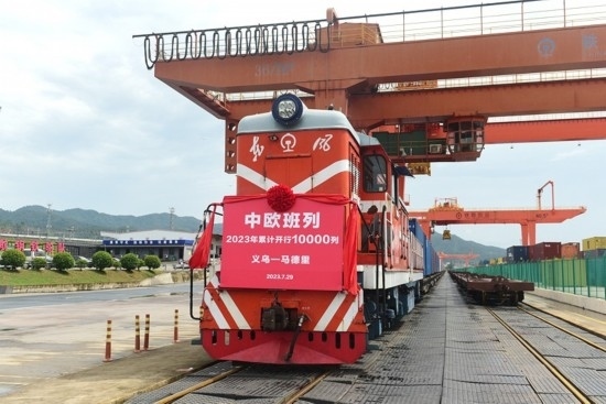 7月29日,隨著滿載110個(gè)標(biāo)箱出口貨物的X8020次中歐班列從鐵路義烏西站緩緩開(kāi)出前往西班牙馬德里,2023年中歐班列累計(jì)開(kāi)行已達(dá)1萬(wàn)列,較去年提前22天破萬(wàn)列;發(fā)送貨物108.3萬(wàn)標(biāo)準(zhǔn)箱,同比增長(zhǎng)27%。