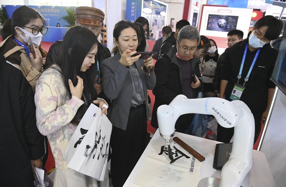 參觀者在首屆中國(guó)國(guó)際供應(yīng)鏈促進(jìn)博覽會(huì)數(shù)字科技鏈展區(qū)科大訊飛展位觀看一款A(yù)I書(shū)法機(jī)器人寫(xiě)毛筆字(2023年12月2日攝)。新華社記者 蔡湘鑫 攝