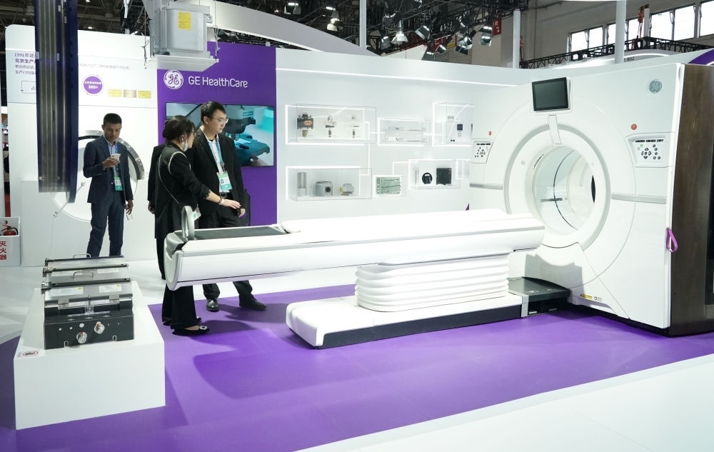 這是在首屆中國(guó)國(guó)際供應(yīng)鏈促進(jìn)博覽會(huì)健康生活鏈展區(qū)拍攝的GE醫(yī)療展位(2023年11月29日攝)。新華社記者 任超 攝