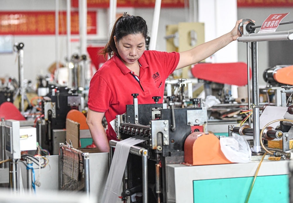 工作人員在??谡\(chéng)佳美塑料包裝有限公司車間生產(chǎn)全生物降解袋(2020年11月4日攝)。新華社記者 蒲曉旭 攝