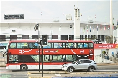 在智利首都圣地亞哥,一輛新能源公交車行駛在街頭。這條路線的十輛雙層新能源公交車由中國制造。近年來,中國制造的新能源汽車不斷進(jìn)入智利市場,憑借綠色環(huán)保的特點(diǎn)和先進(jìn)科技的應(yīng)用廣受當(dāng)?shù)孛癖姷那嗖A。新華社記者 辛悅衛(wèi)攝