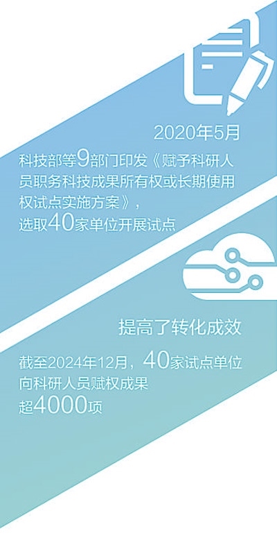 賦權(quán)試點實施以來,40家試點單位向科研人員賦權(quán)成果超4000項。2023年,以轉(zhuǎn)讓、許可、作價投資三種方式轉(zhuǎn)化科技成果合同金額達36.25億元,參與試點的科研人員普遍可獲科技成果轉(zhuǎn)化收益70%以上。僅2023年,試點單位對科研人員的現(xiàn)金股權(quán)獎勵就高達9.33億元。