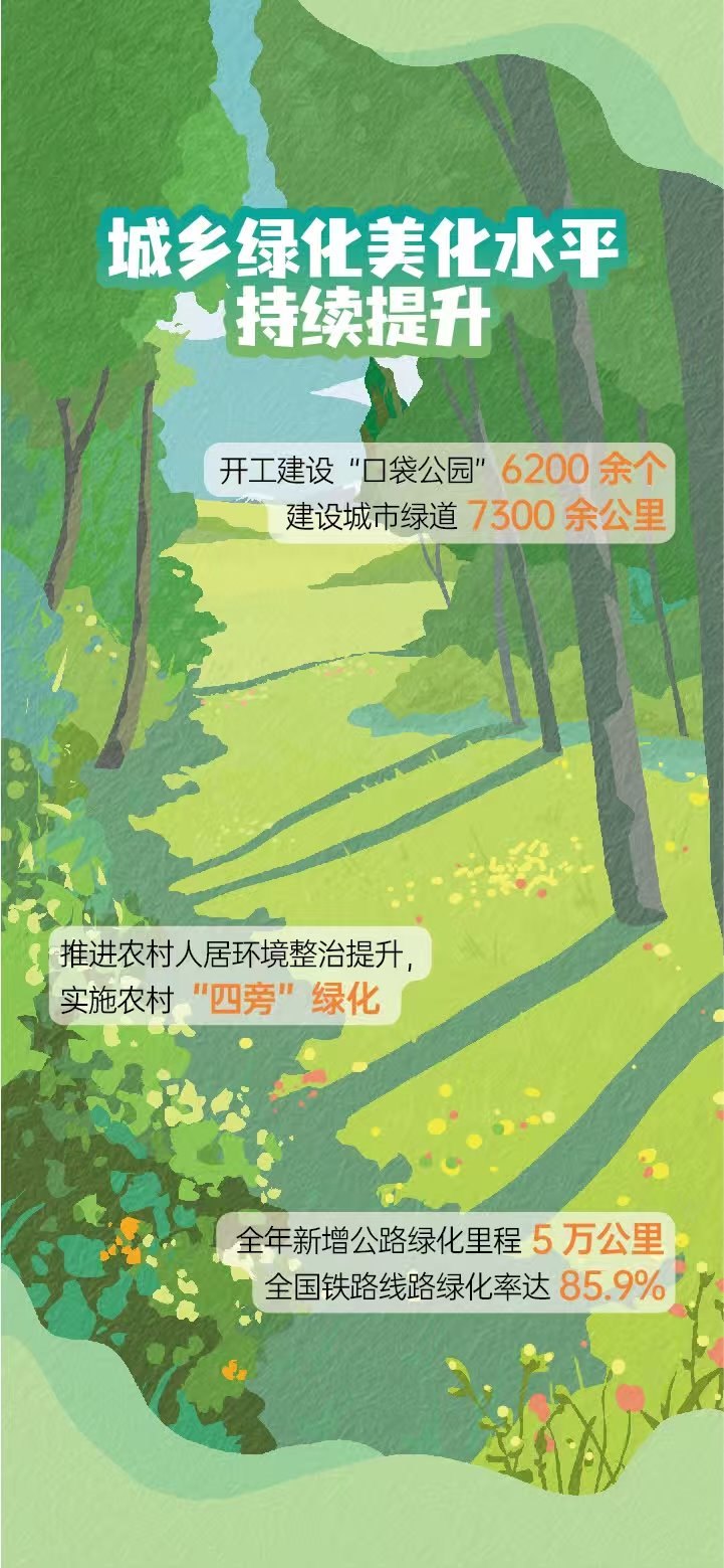 張利明介紹,過去一年,山水林田湖草沙系統(tǒng)治理取得新進展,城鄉(xiāng)綠化美化水平持續(xù)提升。組織實施176個“雙重”工程項目、10個國土綠化示范項目。推進實施“十四五”27個山水林田湖草沙一體化保護和修復工程項目、49個歷史遺留廢棄礦山生態(tài)修復示范工程項目。森林可持續(xù)經(jīng)營實施面積擴大到66.7萬公頃以上。全國林草碳匯試點市(縣)和國有林場碳匯試點實施面積達6.8萬公頃。新增水土流失治理面積6.4萬平方公里。開工建設“口袋公園”6200余個,建設城市綠道7300余公里。新增公路綠化里程5萬公里,全國鐵路線路綠化率達85.9%。