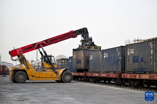 4月3日,在呼和浩特市新暢鐵路專(zhuān)用線(xiàn),正面吊進(jìn)行集裝箱裝運(yùn)作業(yè)。