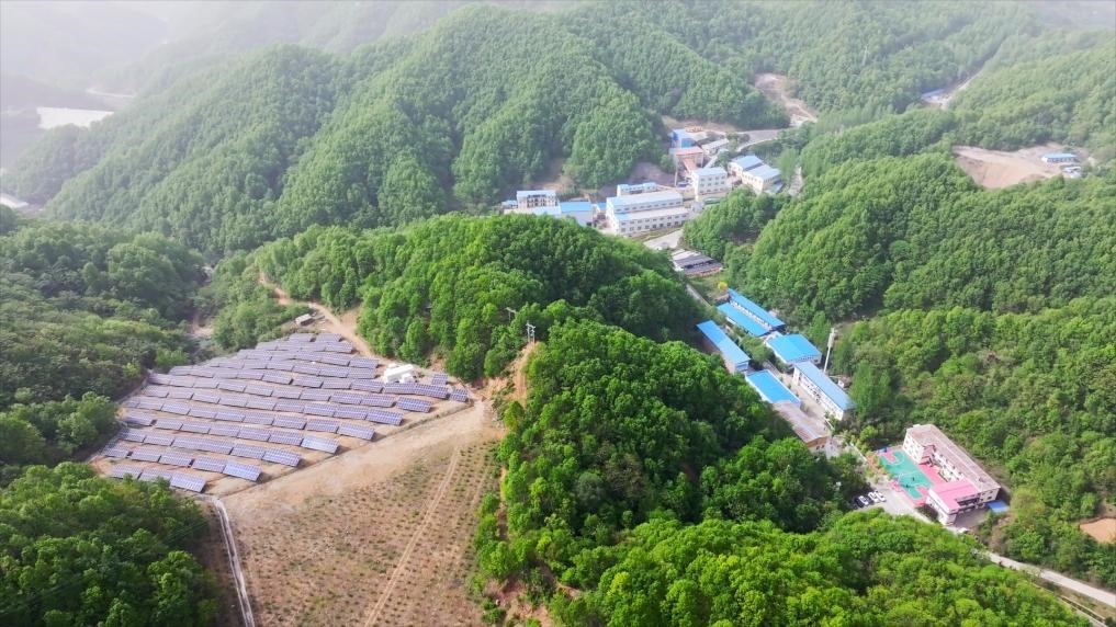 驅(qū)車駛?cè)肼鍖幙h伏牛山區(qū),在紫金礦業(yè)集團(tuán)旗下的洛陽(yáng)坤宇礦業(yè)有限公司,已閉庫(kù)的尾礦庫(kù)上,光伏電板依山勢(shì)整齊排列,深藍(lán)色的面板與周邊翠綠的樹(shù)木交相輝映,科技感十足。