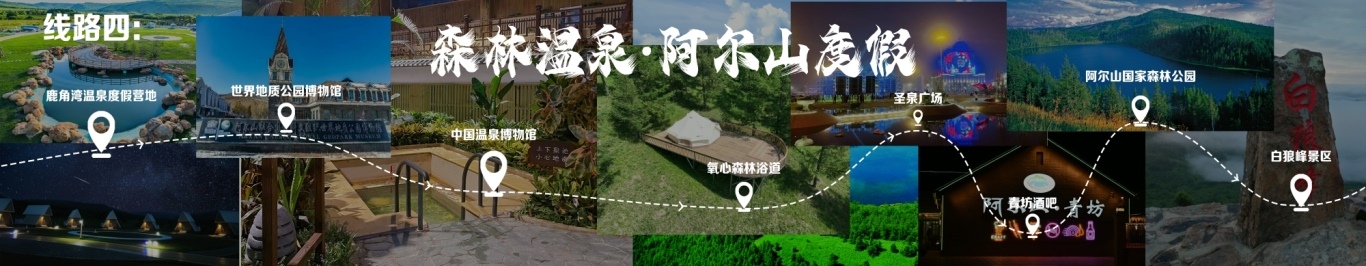 線路行程由阿爾山出發(fā),至鹿角灣溫泉度假營地,至世界地質(zhì)公園博物館,至中國溫泉博物館,再至氧心森林浴道,再至圣泉廣場,再至青坊酒吧,再至阿爾山國家森林公園,終點為白狼峰景區(qū)。