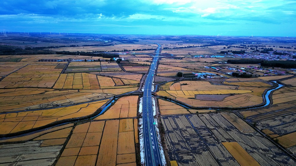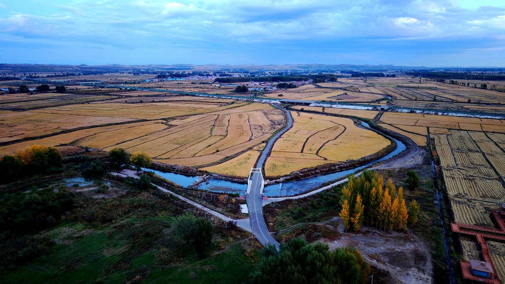9月25日,空中俯瞰暮色中的三合村,遠(yuǎn)山如黛,稻田如畫,金色的麥浪,映襯著豐收的底色。