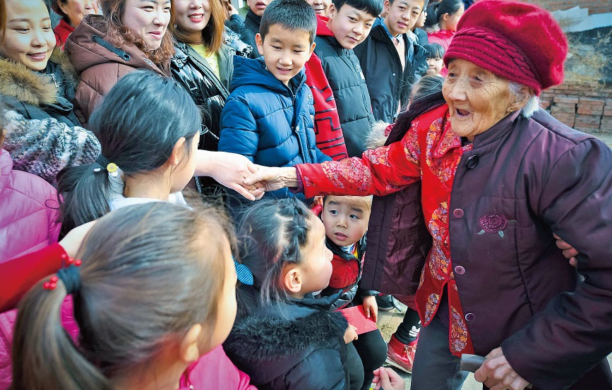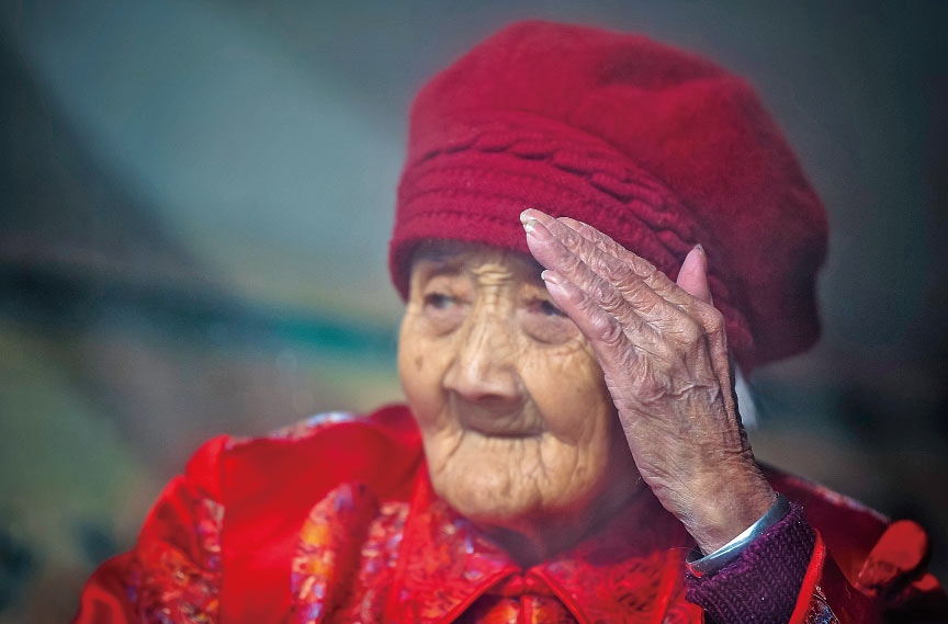 老人的兒孫們如今大多都在外學習、工作、做生意,大家族的成員日子都過得紅紅火火。對于老人來說,子孫滿堂是最幸福的事;對于孩子們來說,老人健康長壽,也是他們最大的愿望。五世同堂,98口人,百歲老人賈先女露出幸福的笑容。