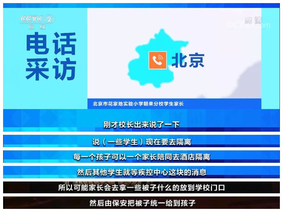 北京市花家地實(shí)驗小學(xué)朝來分校 學(xué)生家長:現(xiàn)在應(yīng)該是做完核酸檢測,在等結(jié)果了。老師在群里面會通知我們,孩子可能明天開始線上上課。