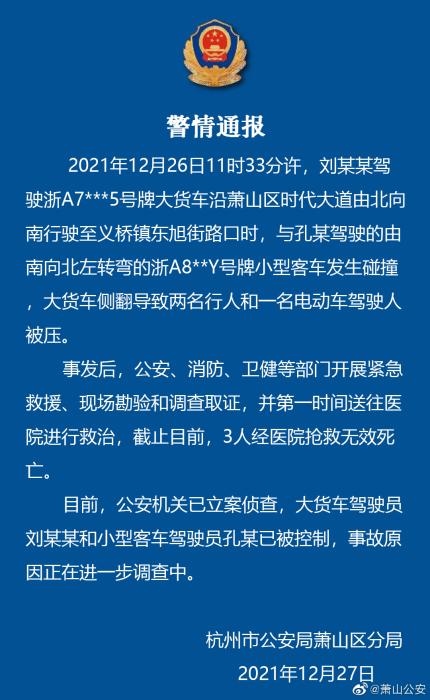 中新網(wǎng)12月27日電 杭州市公安局蕭山區(qū)分局27日通報(bào),12月26日11時(shí)33分許,一大貨車與一小型客車在蕭山區(qū)一路口發(fā)生碰撞,大貨車側(cè)翻導(dǎo)致兩名行人和一名電動(dòng)車駕駛?cè)吮粔?。截至目前?人經(jīng)醫(yī)院搶救無效死亡。