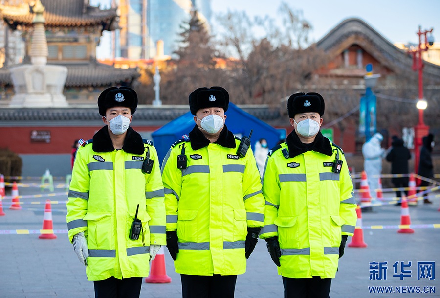 2月21日,在呼和浩特市玉泉區(qū)小召街道五塔寺廣場臨時(shí)核酸采樣點(diǎn),玉泉交管大隊(duì)民警在執(zhí)勤。新華網(wǎng)發(fā) (丁根厚 攝)