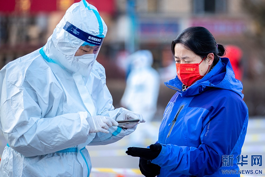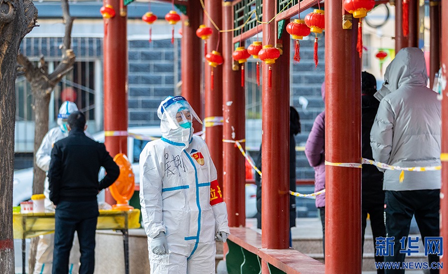 2月21日,在呼和浩特市玉泉區(qū)興隆巷街道芳清園小區(qū)臨時(shí)核酸采樣點(diǎn),點(diǎn)位長在核酸采樣現(xiàn)場工作。新華網(wǎng)發(fā) (丁根厚 攝)