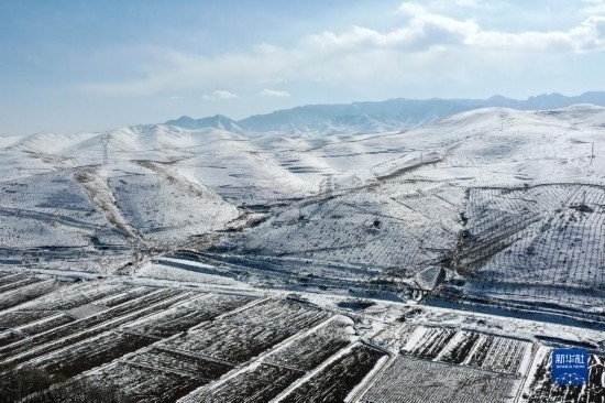 2月14日拍攝的烏鞘嶺及周邊雪景(無(wú)人機(jī)照片)。