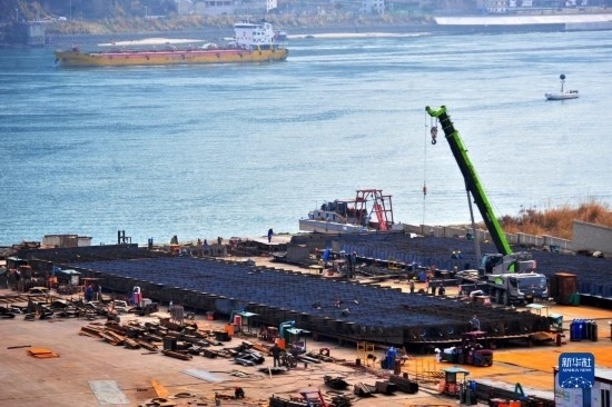 2月14日,湖北省宜昌市夷陵區(qū)樂天溪造船基地工人在加工制造大型貨船。
