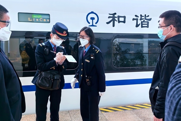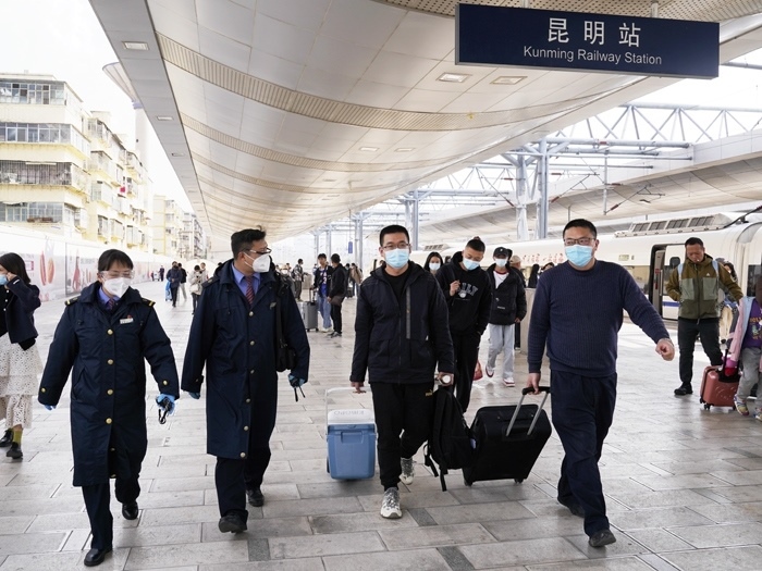 云縣站工作人員引導(dǎo)醫(yī)務(wù)人員進(jìn)入站臺乘坐動車。中國鐵路昆明局集團(tuán)有限公司供圖