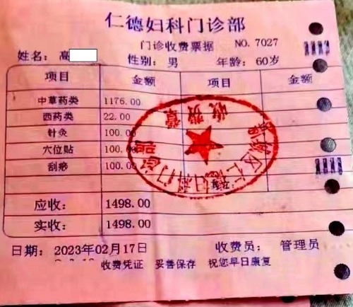 高先生被說動了,在王女士的陪同下來到了這名男子口中的“仁德醫(yī)院”。進(jìn)去以后,發(fā)現(xiàn)醫(yī)院的名字叫“仁德婦科門診”。醫(yī)生確實如男子所說的那樣,告訴高先生不用做手術(shù),給開了1498元的中藥和中醫(yī)治療項目(如圖)。