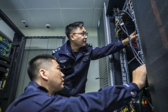 圖為歐陽軒乾與同事對服務(wù)器開展技術(shù)巡檢,及時排查故障隱患。