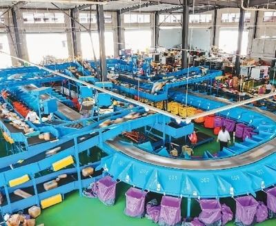 湖南省永州市藍(lán)山縣創(chuàng)品國際智慧物流園藍(lán)山星河物流科技有限公司的員工在智能分揀作業(yè)線上工作。 彭 華攝(人民圖片)